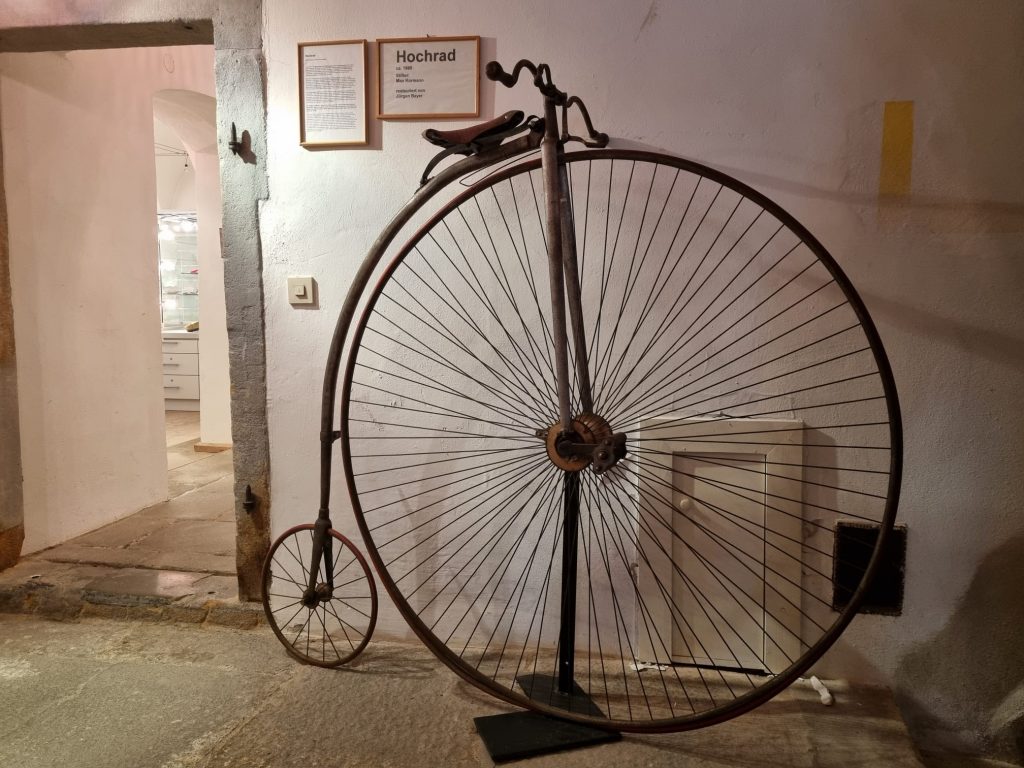 Unser von Max Kormann gestiftetes und von Jürgen Bayer restauriertes Hochrad wurde um 1885 gebaut und gehört damit zu den letzten seiner Art.