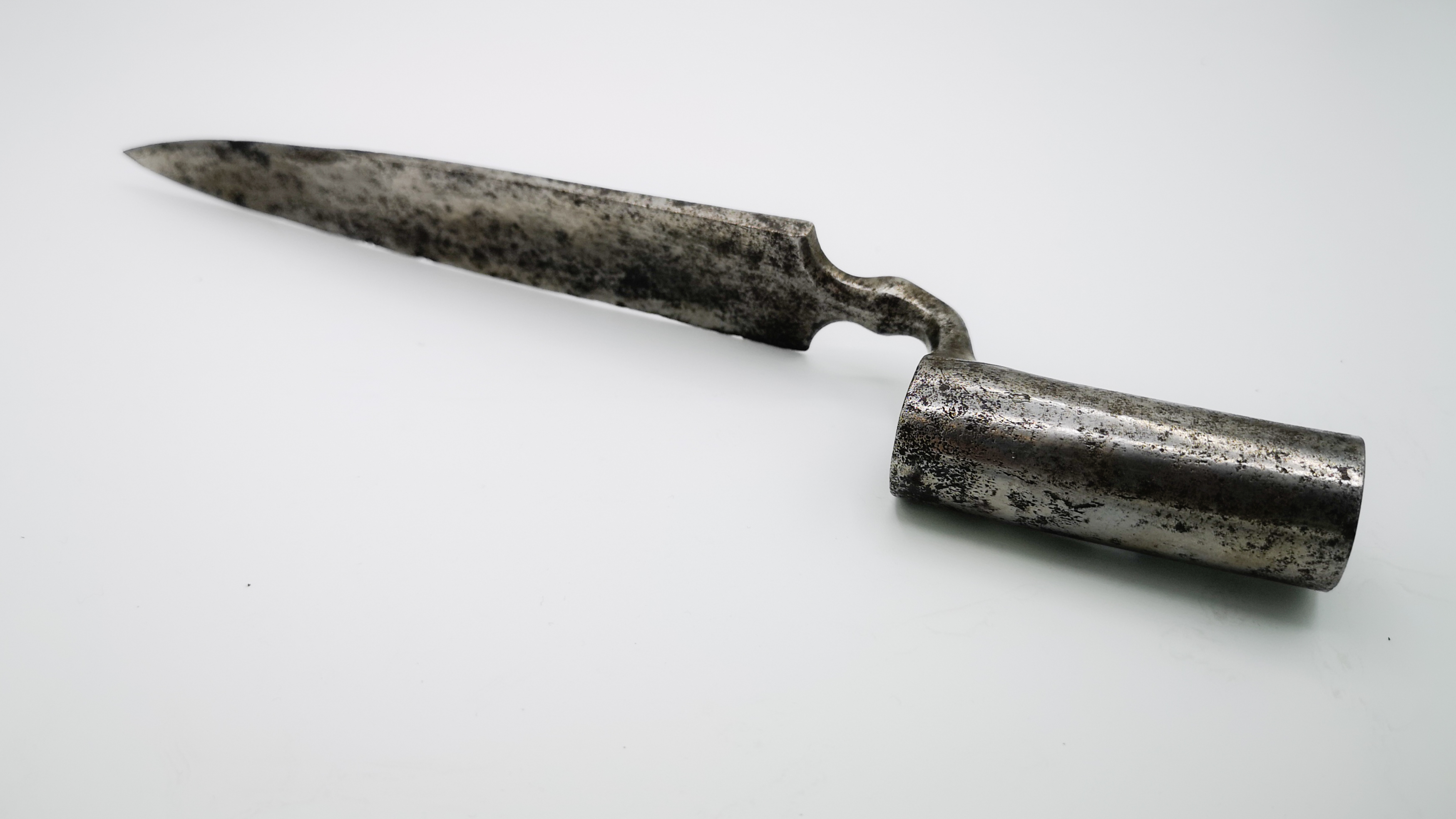 Französisches Bajonett für ein Offiziersgewehr mit einem geknöpften und facettierten Bajonettarm. Flache Messerklinge mit flachem Rücken und falscher Schneide am Klingenort. Tülleneinschnitt doppelt rechtwinkelig gebrochen zur Aufnahme der Bajonetthaft des Gewehrs. Übergang von Bajonettarm in Tülle mittels aufgelegtem und facettierten "Schild".