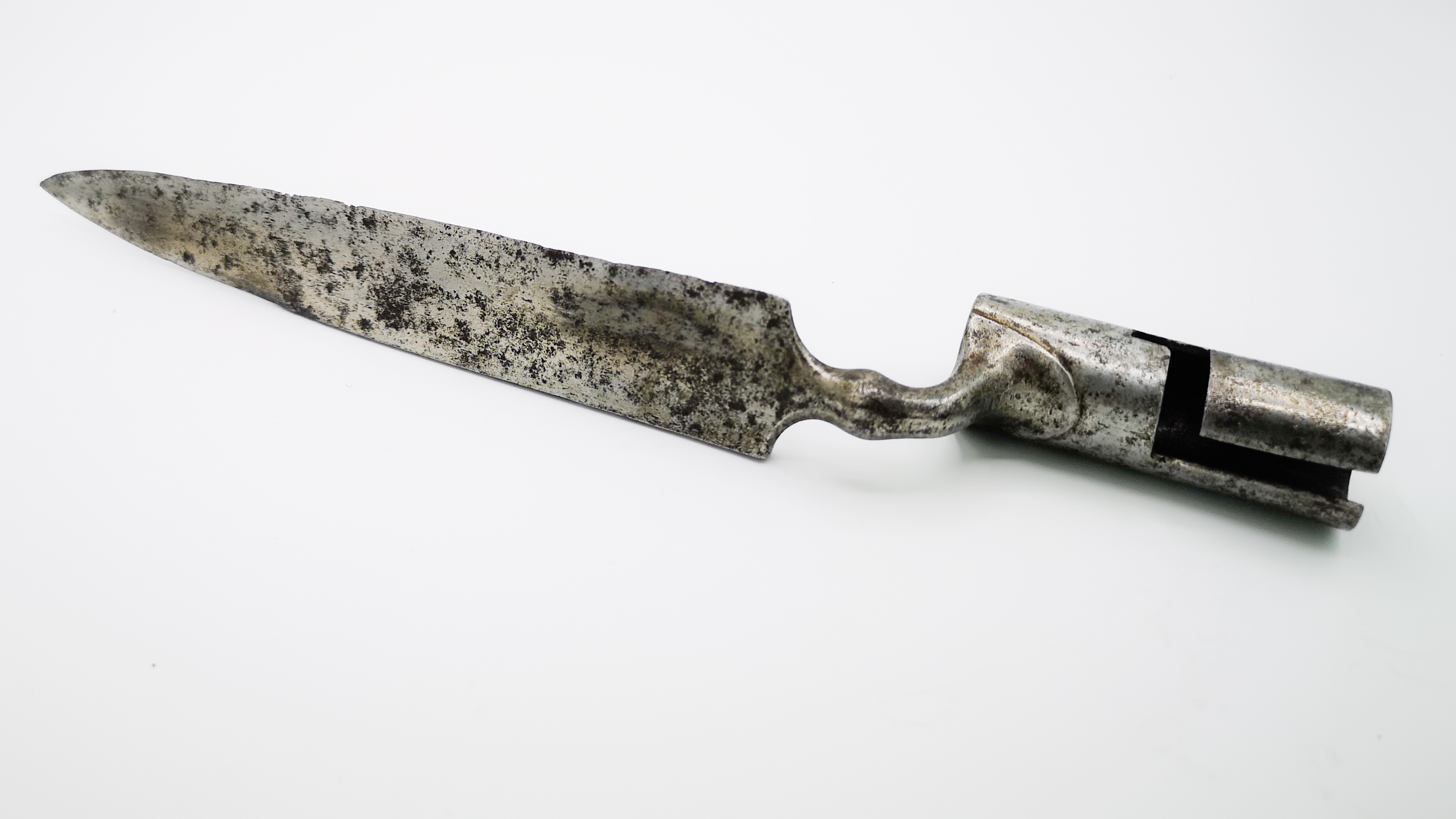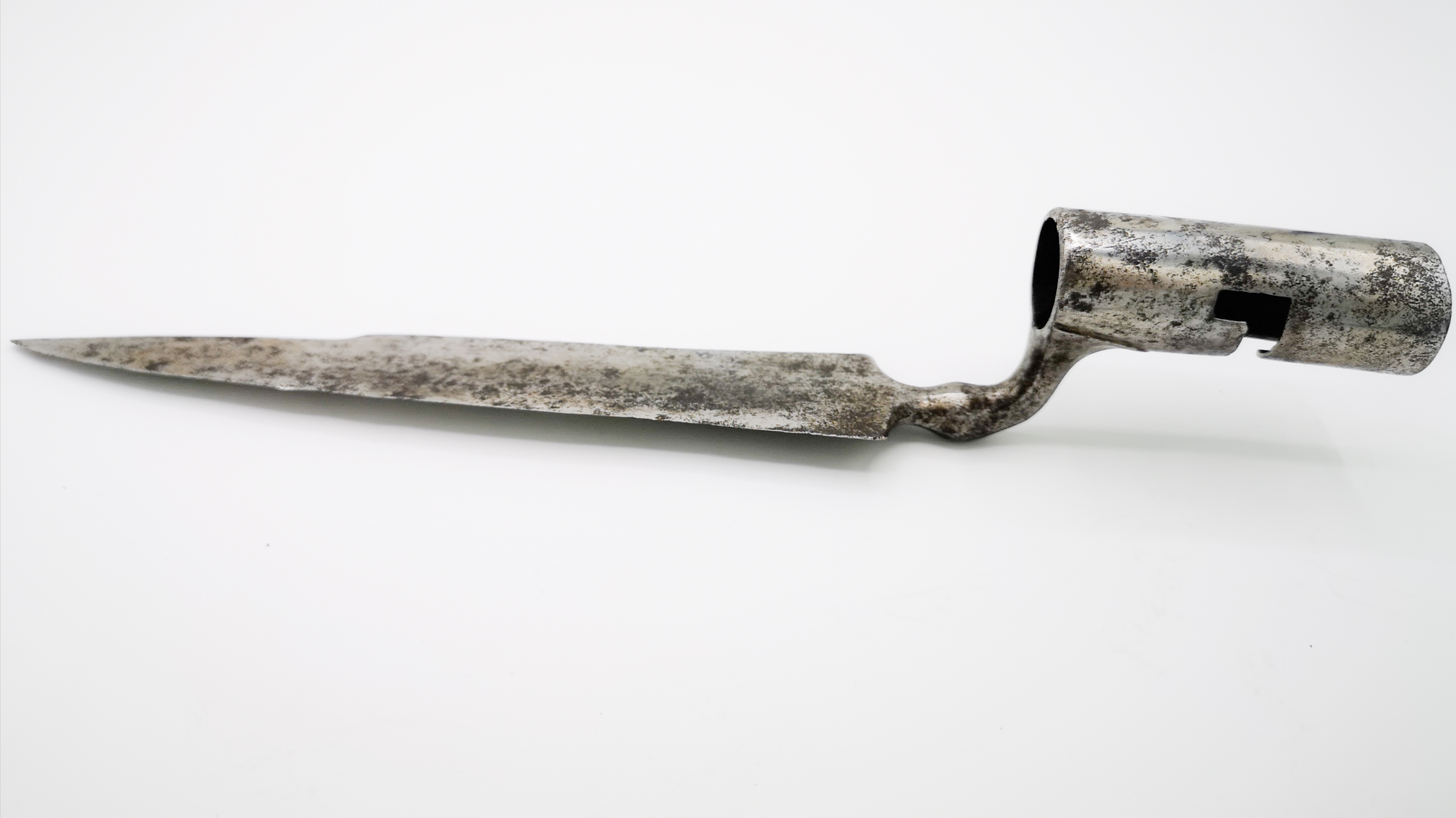 Wie ihre britischen Standesgenossen trugen die französischen Offiziere Gewehreals persönliche Bewaffnung, diese Waffenwaren ob des Standes ihrer Besitzerfeiner gearbeitet als die regulären Armee-Varianten, dennoch robuster und teils puristischer als klassische Jagdgewehre der Zeit. Anstatt Miniaturversionen des regulären Armee-Bajonetts zu verwenden, wurden die für die französischen Offiziersgewehre spezielle Bajonette gefertigt. Die messerartige Klinge lehnt sich an jagdliche Bajonette und Espontons an, sodass allein durch die Spitze eines aufgepflanzten Bajonetts sofort erkannt werden konnte, wo ein Offizier auf dem Schlachtfeld stand. Form und Ausführung des Objekts ist typisch für diesen Bajonett-Typ, derin den 1740er und 1750er Jahren verwendet wurde. Gefertigt wurden diese Stücke durch verschiedene in St. Etienne ansässige Büchsenmacherfamilien, was sich durch markierte Objekte nachweisen lässt. Wie die Gewehre, waren diese Bajonette eine private Anschaffung des jeweiligen Offiziers, keine reguläre Armee-Bewaffnung.